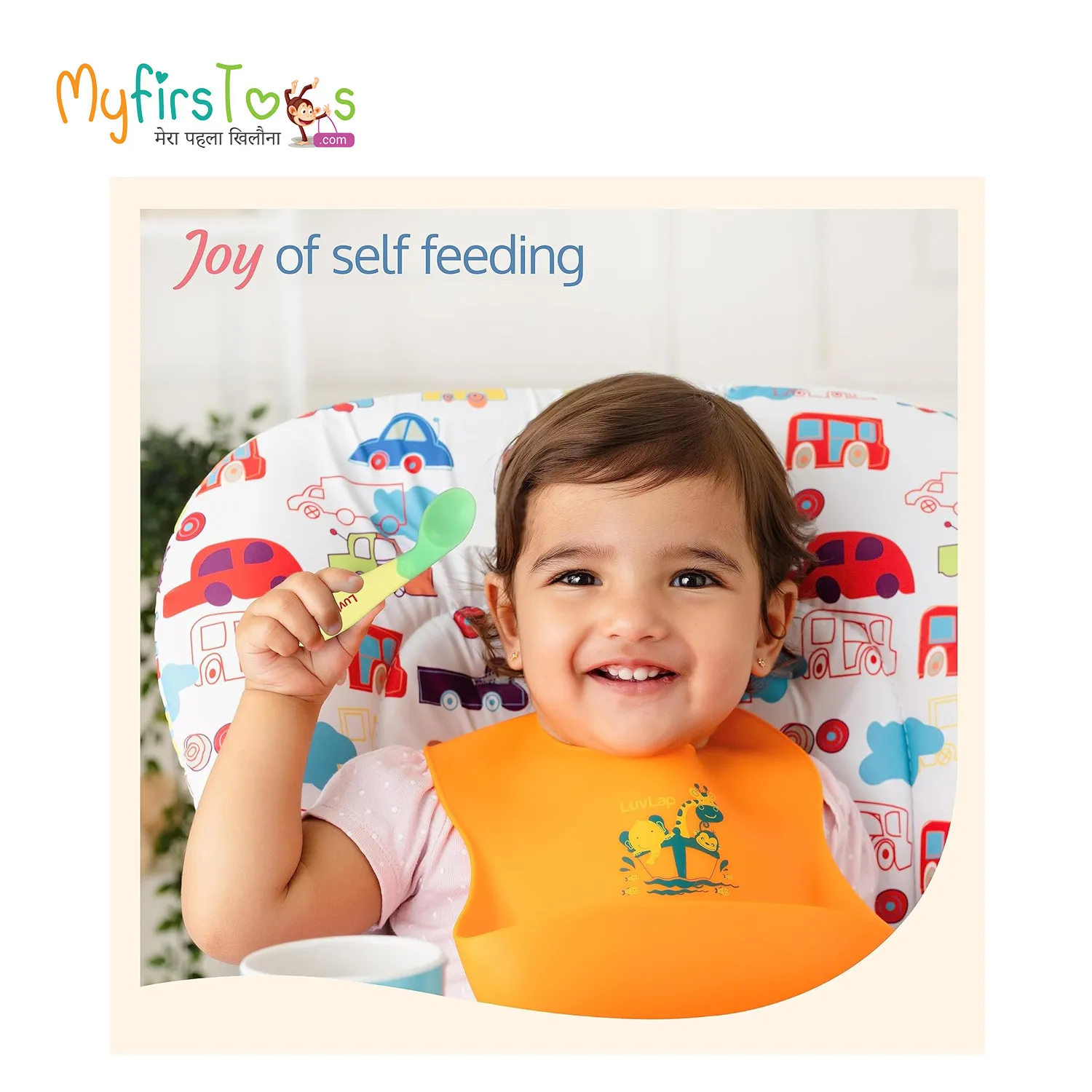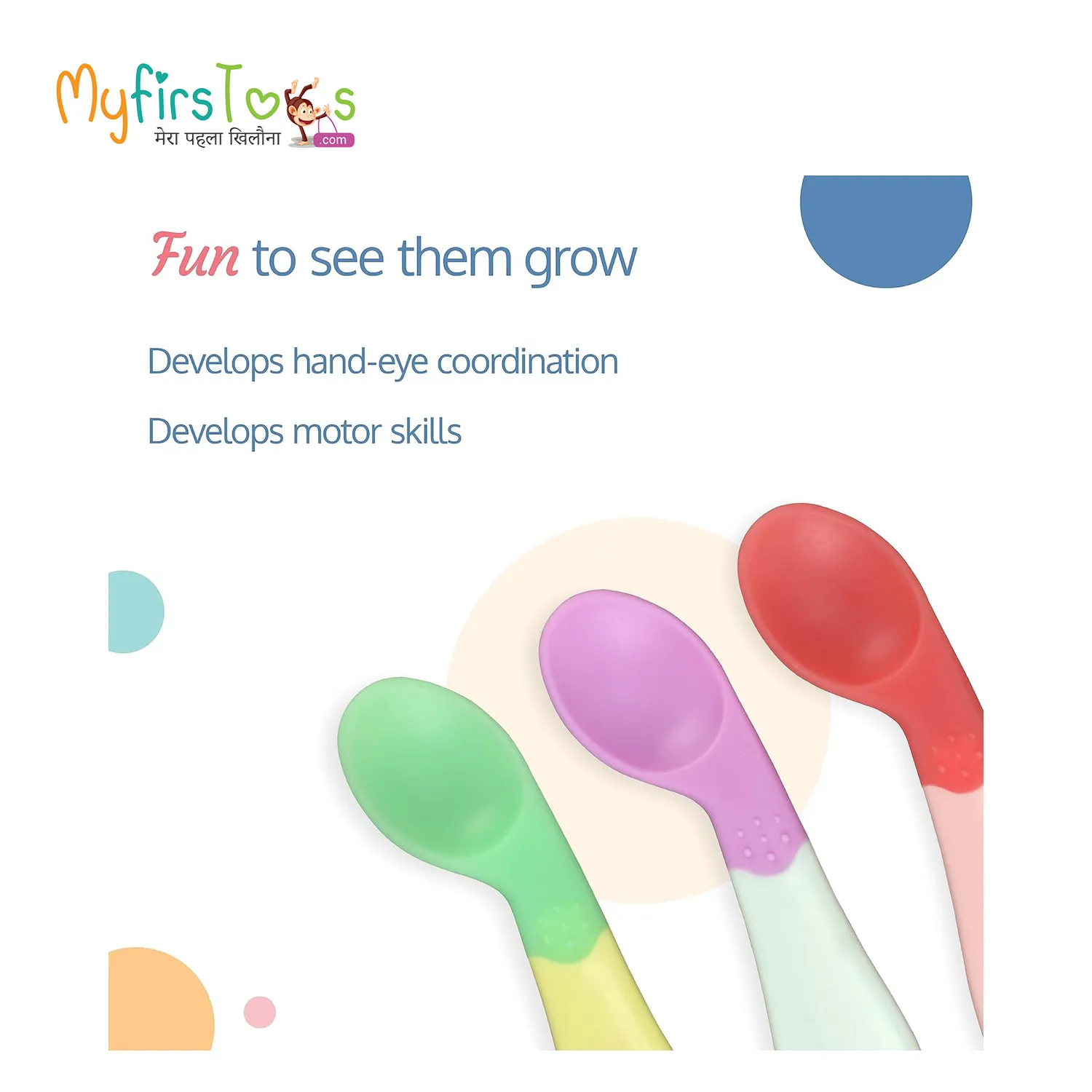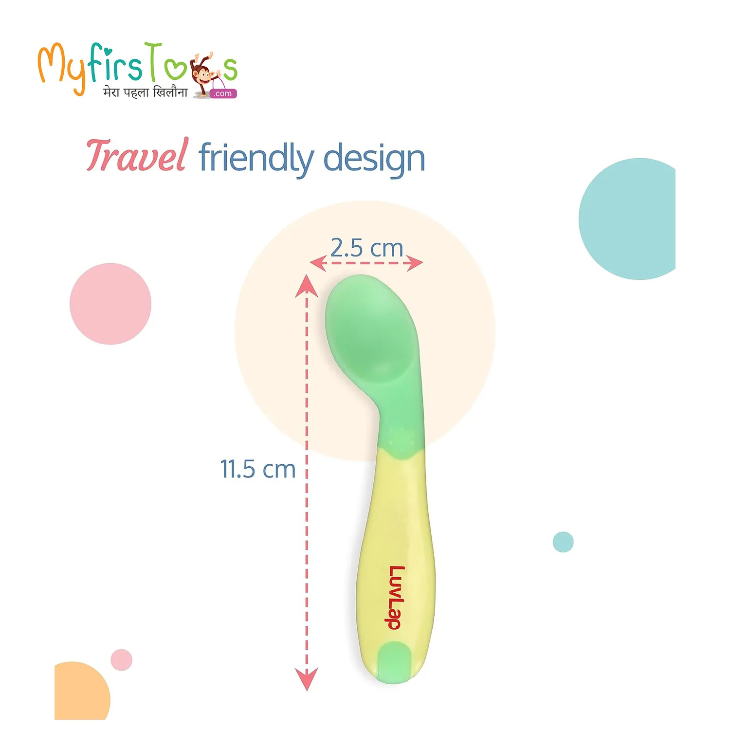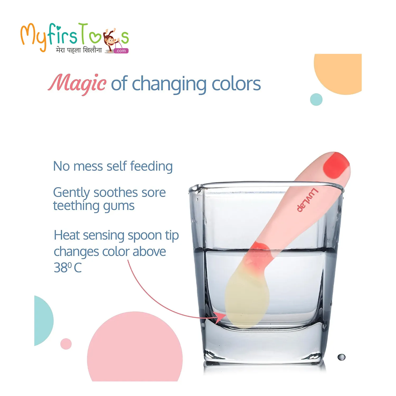 Unique temperature sensing spoon made of heat sensing silicone head & plastic handle, changes colour when the feed temperature is above 38°C. Flexible curve tip is gentle on teething gums