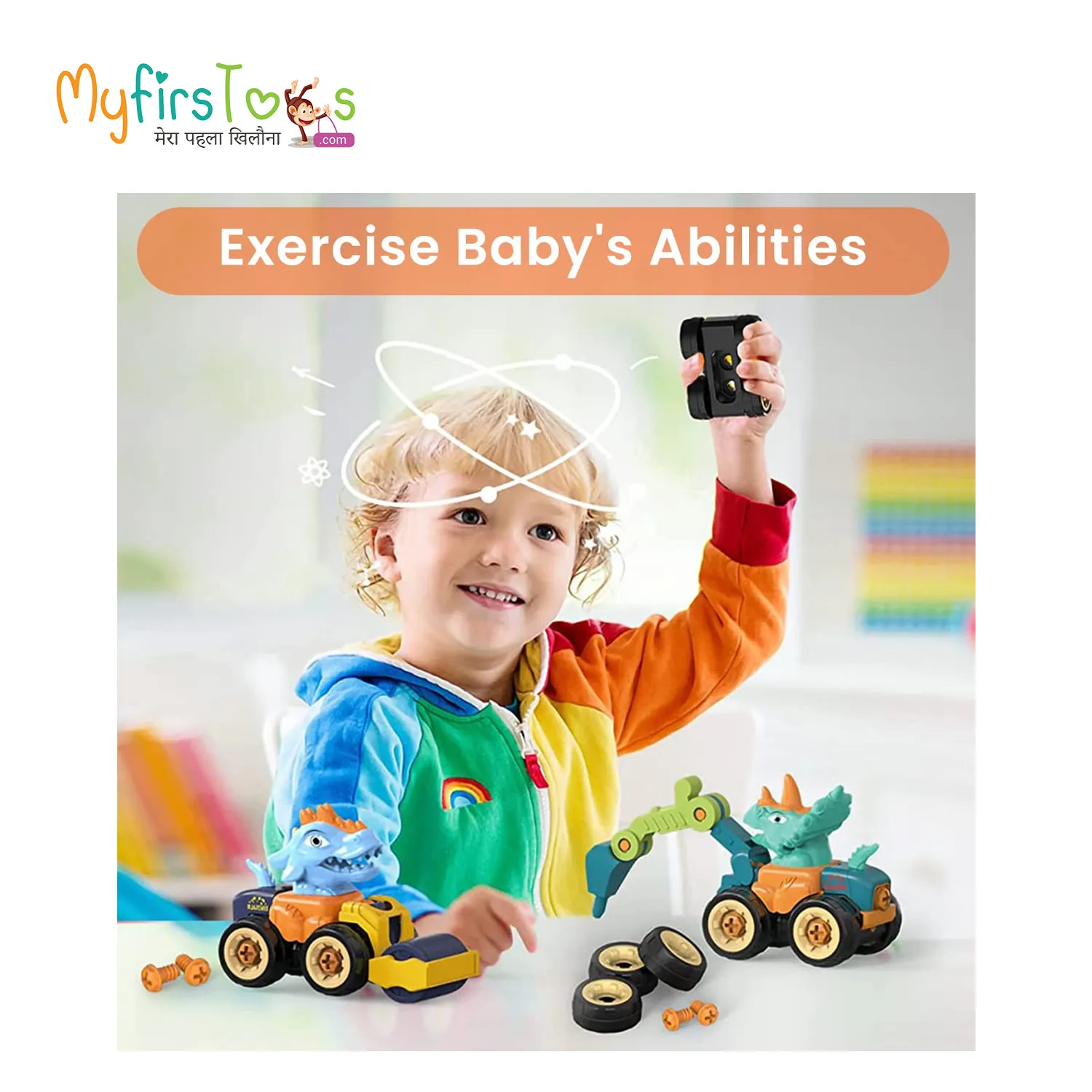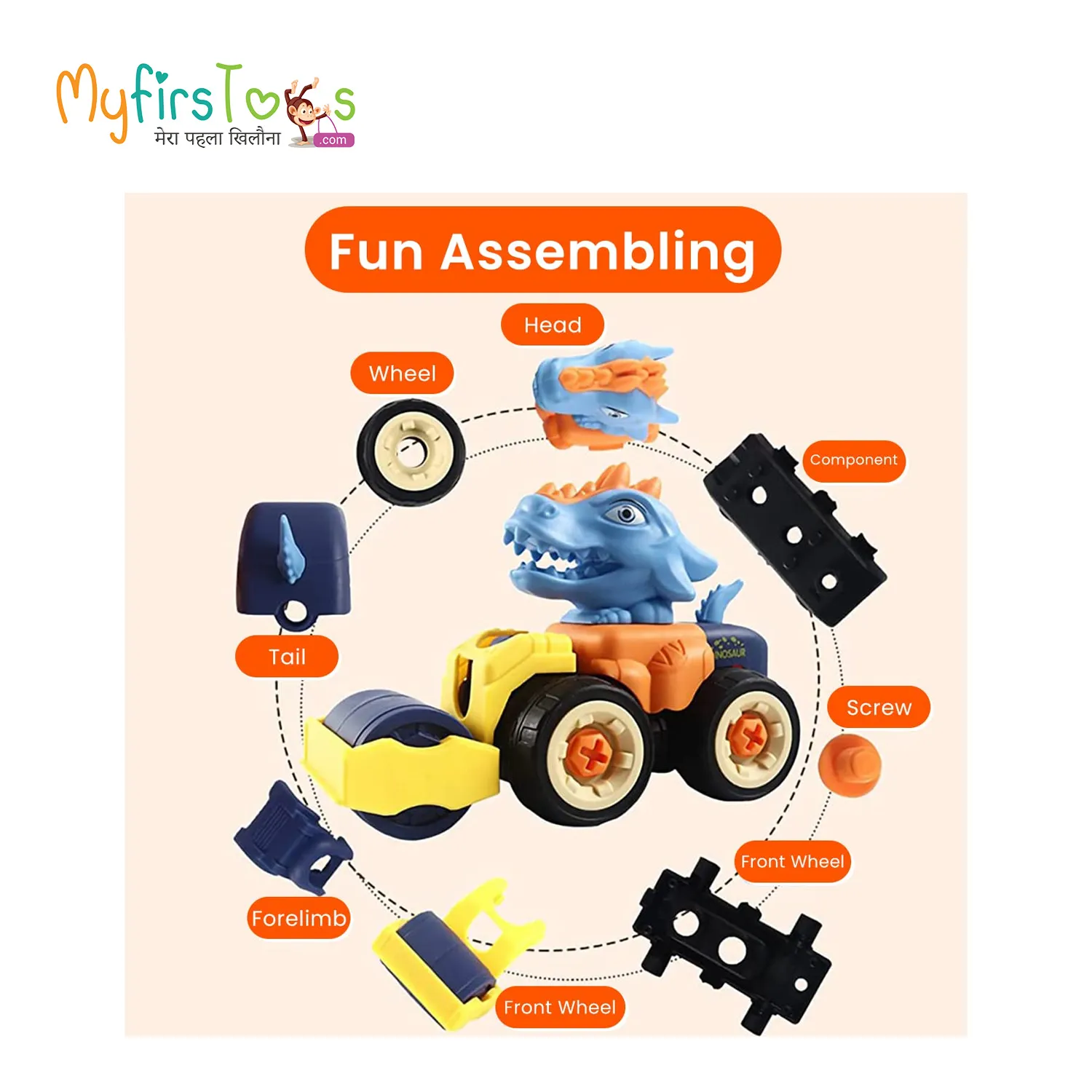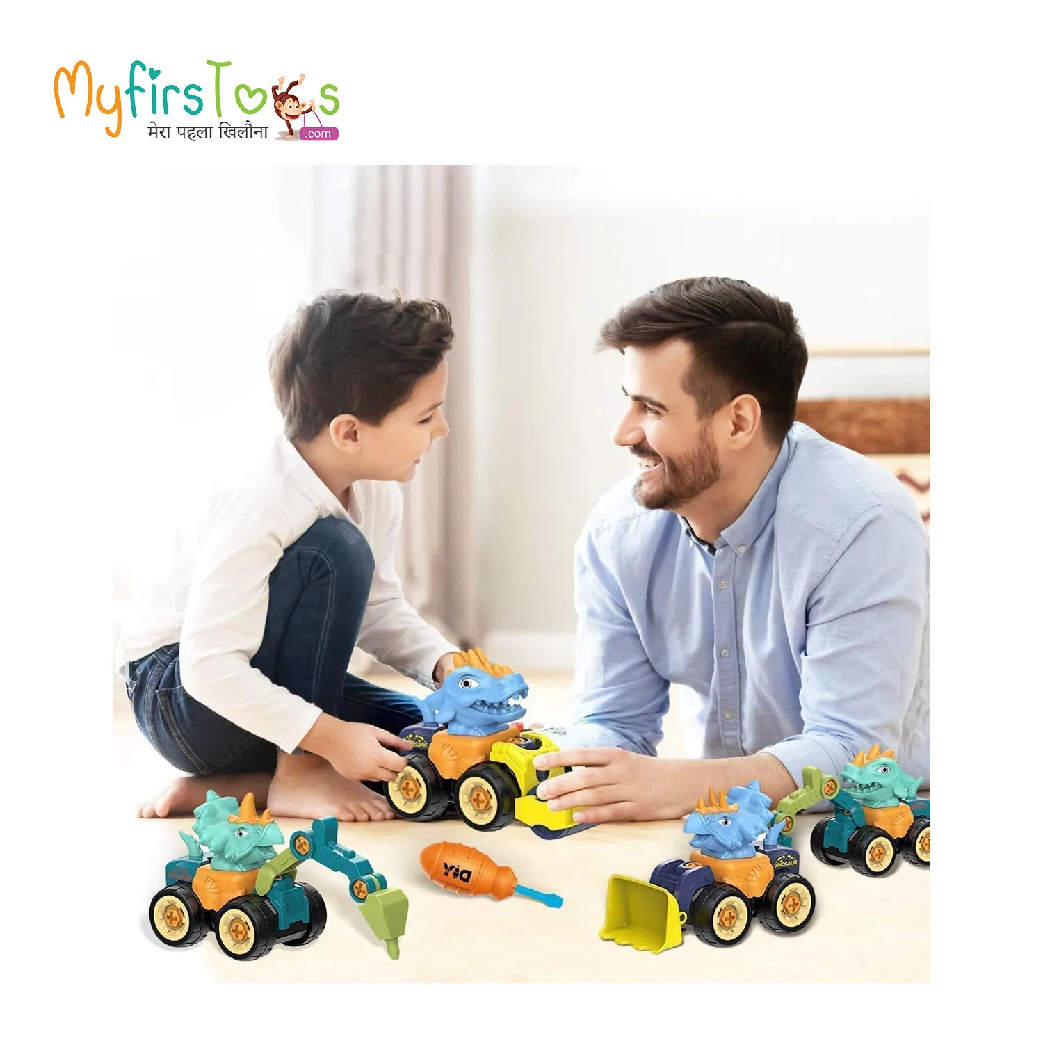 • DIY ASSEMBLE DINOSAUR ENGINEERING CAR TOYS: Fun combination of dinosaur toy and engineering vehicle, this set of 4 dinosaur truck toys for kids includes 4 different assembly dinosaur car toys, one kid-use mini screwdriver,s and one toy wrench. Use the mini screwdriver to install or remove the screwcreate your own engineering truck, cute cartoon characters also can greatly stimulate a kid's imagination. (NOTE: The toy kit including small accessories, and screws, is not for kids under 3 years old.)