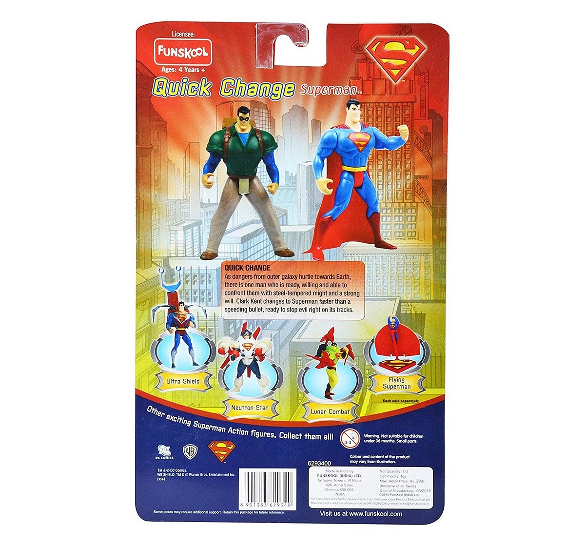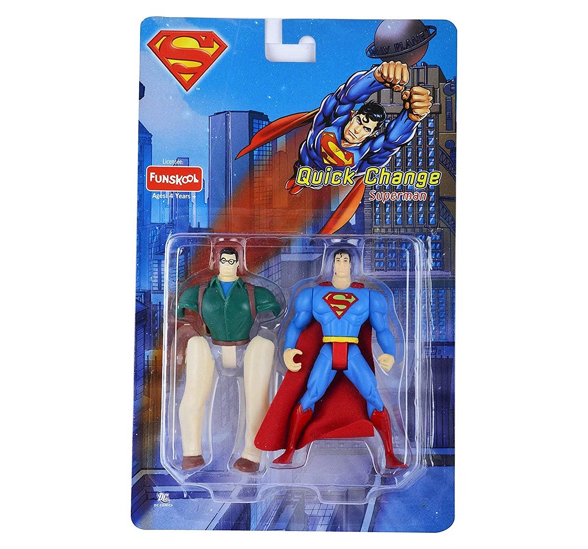 This figure transform from clark kent into superman | A must have for all superman lovers | Package Contents: Funskool Superman Quick Change Figure | Material: Plastic; Is battery required: No; Is battery included: No | Recommended Age: 48 Months To 99 Years; whether assembly required: no; Assembly time: 5 mins