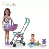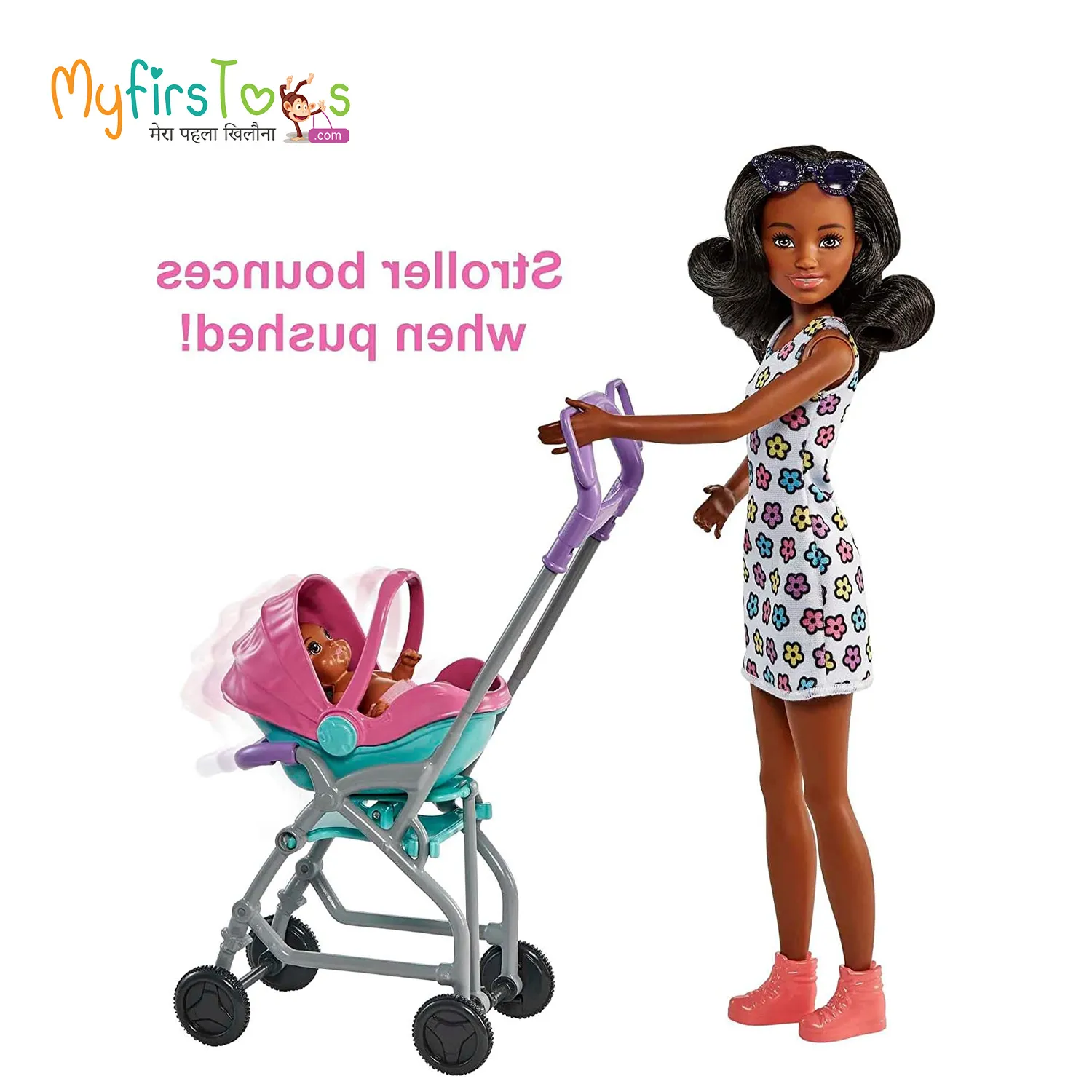 • This Skipper Babysitters Inc. playset features a babysitter doll, a baby doll and a stroller that bounces up and down as it's pushed!