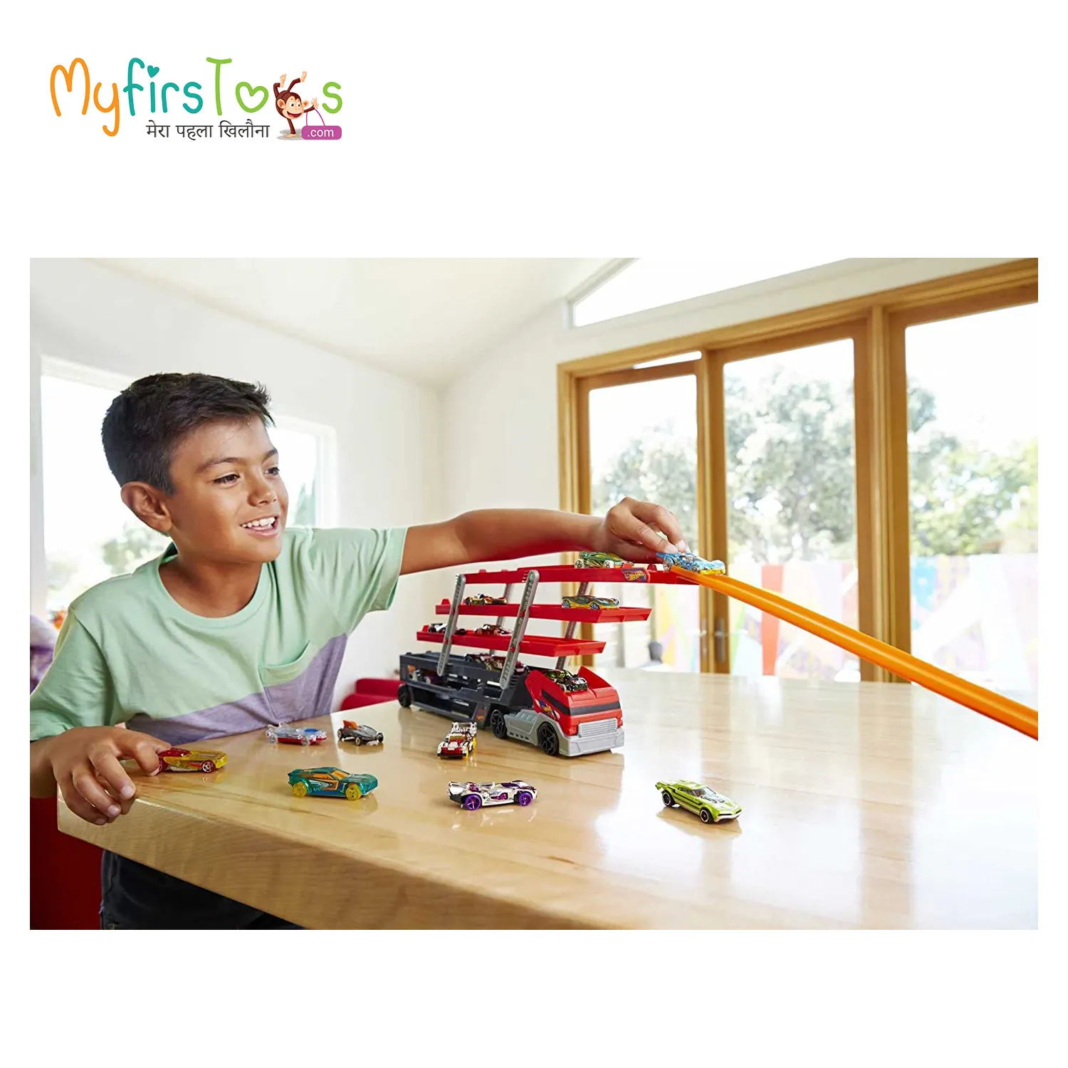 • Product 2: There are even more great features that make this big hauler mega unique— connect to Hot Wheels orange track and roll your cars onto a side-by-side race. (Note:Orange track is not included)